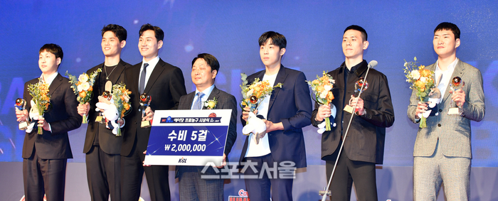 수비5걸상을 수상한 선수들이 30일 삼성동 인터콘티넨탈호텔에서 열린 2022-23SKT 에이닷 프로농구 시상식에서 상을 수상한 후 기념촬영을 하고 있다. 2023.03.30.