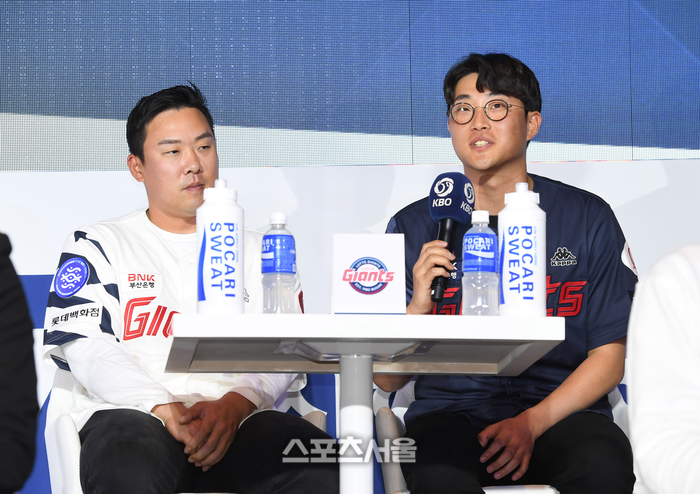 롯데 자이언츠 안치홍(왼쪽)과 박세웅이 30일 서울 용산구 그랜드하얏트서울호텔에서 진행된 2023 KBO 미디어데이 행사에서 사회자의 질문에 답을 하고 있다. 2023. 3. 30.