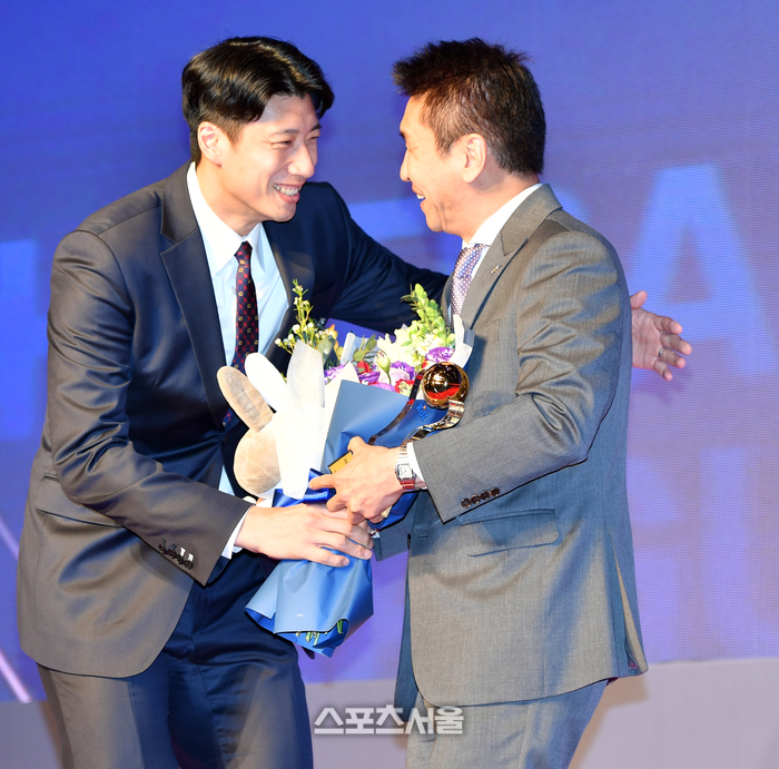 감독상 수상한 김상식 KGC 감독이 30일 삼성동 인터콘티넨탈호텔에서 열린 2022-23SKT 에이닷 프로농구 시상식에서 상을 수상한 후 기념촬영을 하고 있다. 양희종 축하꽃다발 받는 김상식 감독. 2023.03.30.