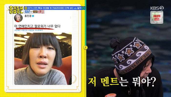 이어 김숙은 과거 홍진경이 올린 눈물 셀카 사진을 보여줬다. 홍진경은 ‘실제 눈물인가’라는 질문에 “인공눈물이 아니다. 진짜 눈물이다. 지금은 팔로워가 18만 명이다”고 밝혔다.