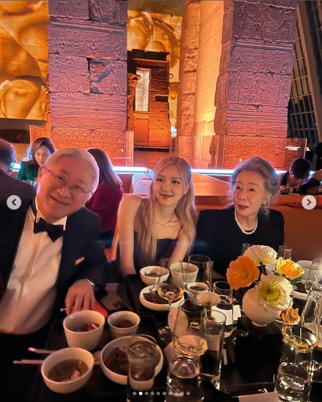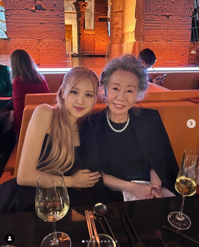 이날 로제는 미국 뉴욕 메트로폴리탄 미술관에서 열린 한 뷰티 브랜드 행사장에 초대받았다. 그곳에서 만난 윤여정과 나란히 앉아 팔짱을 끼고 다정한 한 컷을 남긴 것.