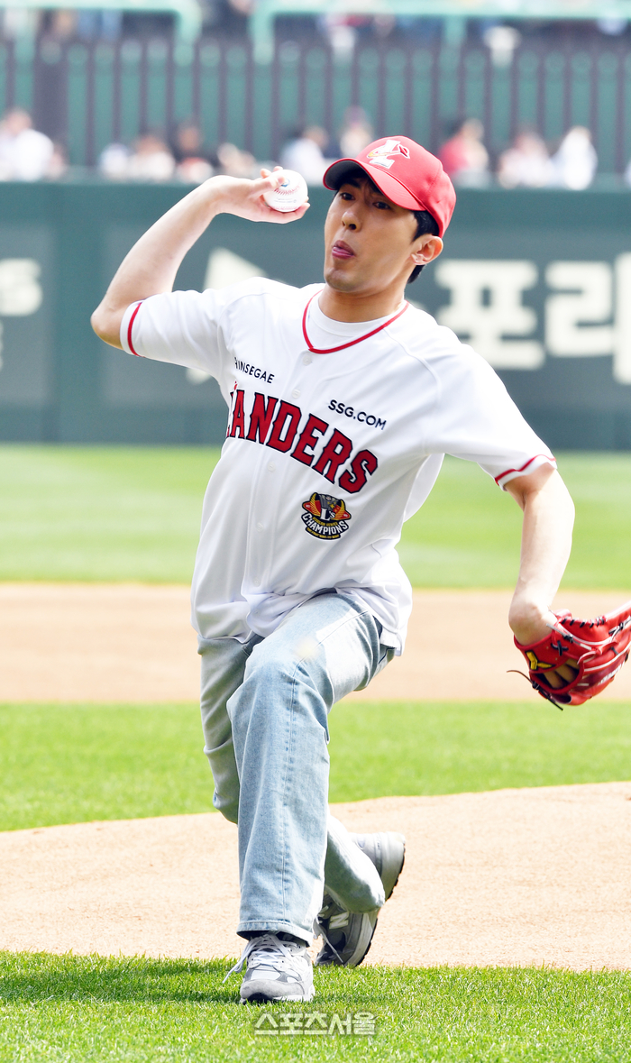 만원관중이 들어찬 가운데 개그맨 김원훈이 1일 인천SSG랜더스필드에서 열린 2023프로야구 SSG와 KIA의 경기에서 시구를 하고 있다. .2023.04.01.
