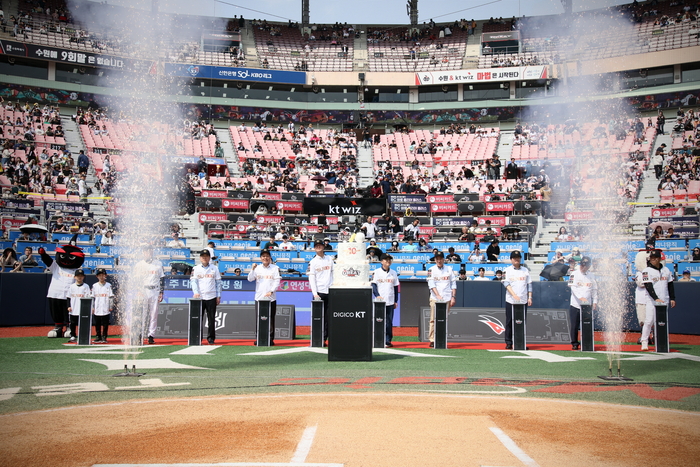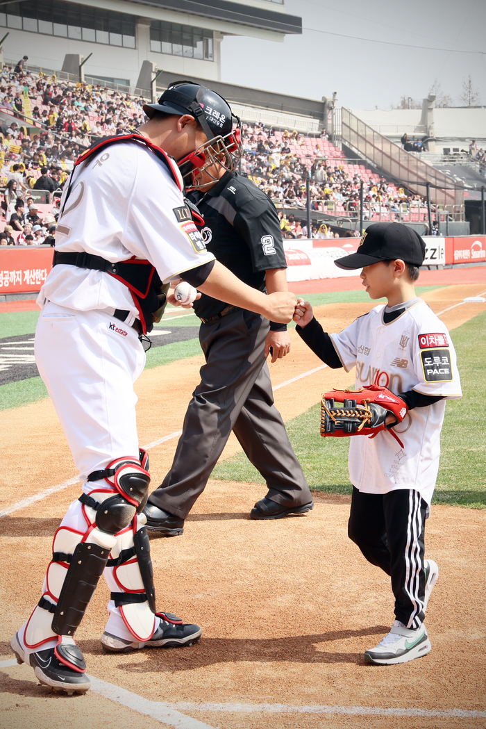 경기의 시작을 알리는 시구자도 특별했다. KT는 창단 해인 2013년 출생한 쌍둥이 어린이 회원인 정진우, 정선우 어린이를 시구자로 초대했다.