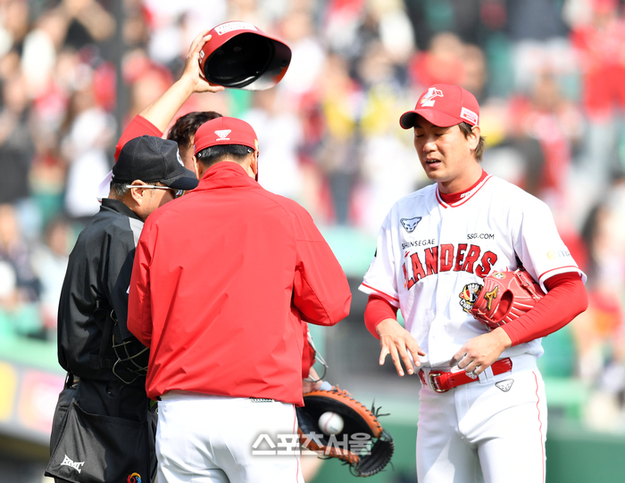 SSG 선발투수 김광현이 1일 인천SSG랜더스필드에서 열린 2023프로야구 SSG와 KIA의 경기 4회초 손가락 이상으로 트레이너를 손짓으로 부르고 있다. 2023.04.01.
