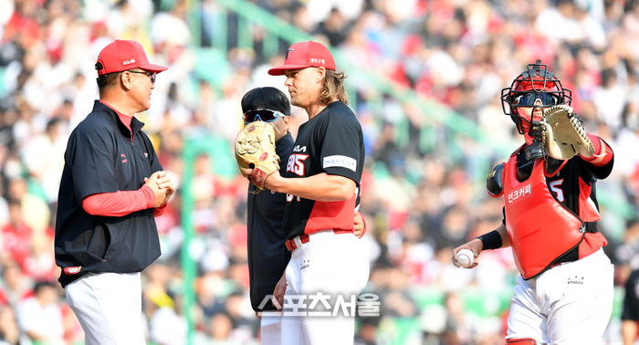 KIA 선발투수 앤더슨이 1일 인천SSG랜더스필드에서 열린 2023프로야구 SSG와 KIA의 경기 7회말 2사 1루에서 김기훈으로 교체되고 있다. 2023.04.01.