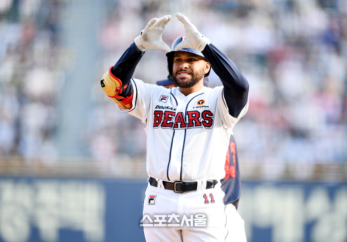 두산 로하스가 1일 잠실야구장에서 열린 2023 KBO리그 롯데와 경기 7회말 2사1,2루 1타점 우전안타를 친 후 세리머니를 하고 있다.