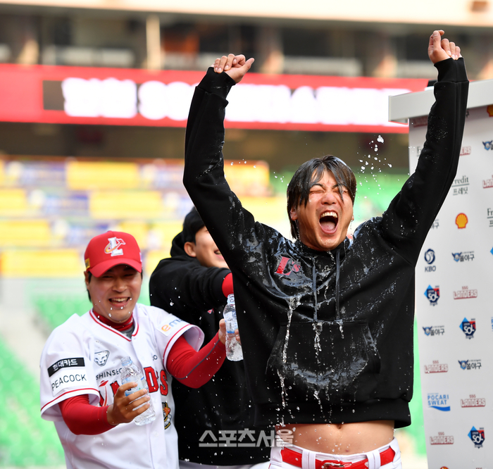 SSG 좌완 선발 김광현이 1일 인천SSG랜더스필드에서 열린 2023프로야구 SSG랜더스와 KIA타이거즈의 경기에서 150승을 달성한 후 후배들의 격한 축하를 받고 있다. 2023.04.01.