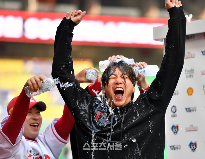 SSG 좌완 선발 김광현이 1일 인천SSG랜더스필드에서 열린 2023프로야구 SSG랜더스와 KIA타이거즈의 경기에서 150승을 달성한 후 후배들의 격한 축하를 받고 있다. 2023.04.01.