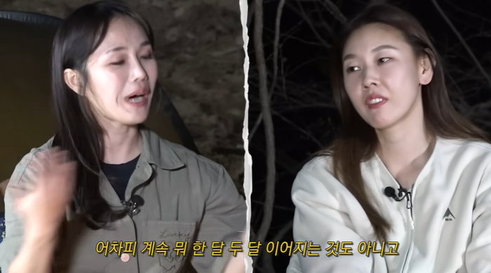 서로 가벼운 인사를 나눈 뒤 두 사람은 보부상 같은 짐을 모두 벌려놓고 텐트를 설치했다. 4인용 텐트라고 하지만 한혜진의 늘씬한 기럭지 덕에 의도치 않은 오붓한 분위기를 연출했다.