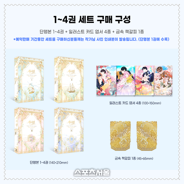 피플앤스토리 측은 세이렌의 폭발적인 인기에 힘입어 3일부터 단행본 예약판매에 들어갔다. 외전 1권을 포함해 총 4권으로 구성된 종이책 단행본 ‘세이렌’은 웹툰 전문 출판사 영컴에서 출판되며 5월 8일까지 예스24, 알라딘, 교보문고 등 주요 온라인 서점에서 예약구매할 수 있다. 우아하면서도 고풍스러운 표지 디자인으로 작품의 매력을 더한 ‘세이렌’은 단행본 4권과 일러스트 카드 엽서 4종, 금속 책갈피 1종을 세트로 구성해 한정 판매하며 예약판매 기간 세트 구매 시 작가 사인 인쇄본이 발송된다. 오프라인 서점에서는 5월 9일부터 만나볼 수 있다.