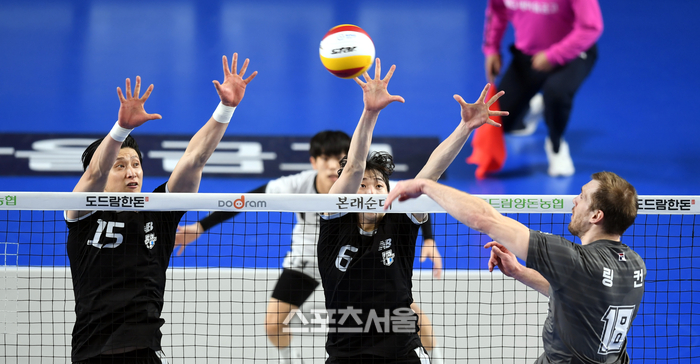 현대캐피탈 문성민(왼쪽)과 김선호가 3일 천안유관순체육관에서 열린 2022~2023 V-리그 챔피언결정전 3차전 대한항공과 경기에서 상대 링컨의 공격을 블로킹하고 있다.