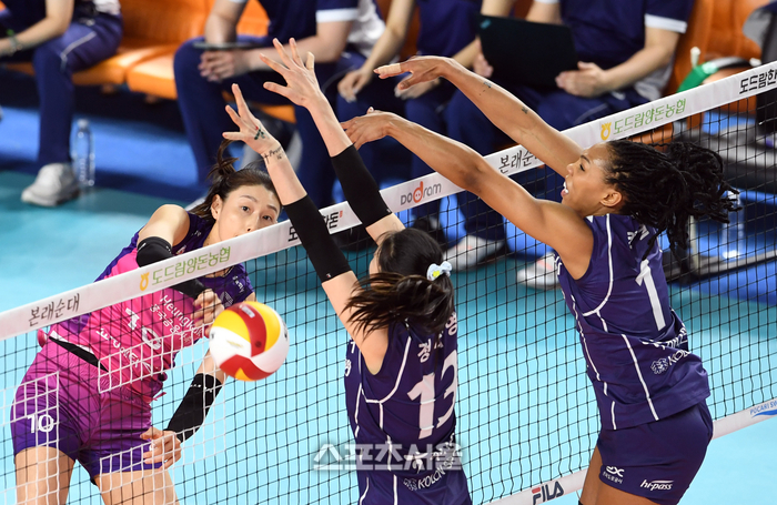 흥국생명 김연경(왼쪽)이 4일 김천실내체육관에서 열린 2022-2023 V리그 한국도로공사와 챔피언결정전 4차전에서 스파이크 공격을 하고 있다. 2023. 4. 4.