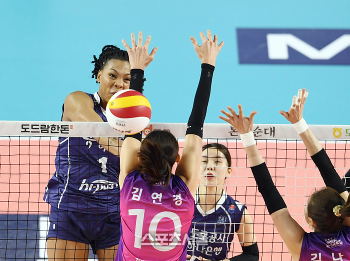 한국도로공사 캘벨(왼쪽)이 4일 김천실내체육관에서 열린 2022-2023 V리그 흥국생명과 챔피언결정전 4차전에서 흥국생명 김연경의 블로킹을 피해 스파이크 공격을 하고 있다. 2023. 4. 4.