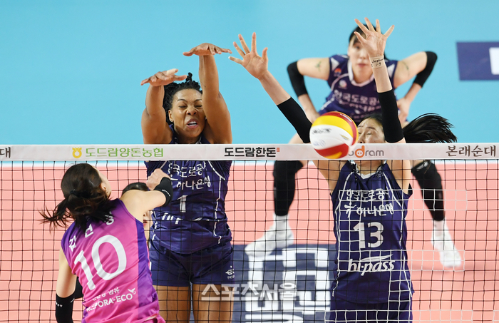 한국도로공사 캘벨(가운데)이 4일 김천실내체육관에서 열린 2022-2023 V리그 흥국생명과 챔피언결정전 4차전에서 흥국생명 김연경의 스파이크를 블로킹하고 있다. 2023. 4. 4.
