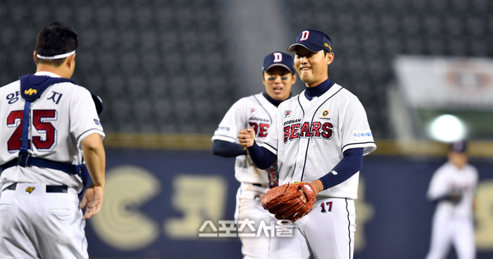 두산 마무리 홍건희가 4일 잠실구장에 열린 2023 프로야구 두산베어스와 NC다이노스의 경기 9회초 삼자범퇴로 마무리한 후 양의지와 자축하고 있다. 2023.04.02.
