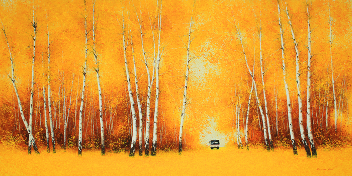 멀리 지평선 너머로 노란 봄꽃이 흐드러지게 피어있는가 하면, 빨간 꽃, 혹은 초록 숲 등이 일렁거리는 모습은 마치 추상화같은 분위기를 낸다. 그 안에 아주 자그맣게 완행버스가 담겨있어 자연이 더욱 크고 아름답게 느껴지게 하는 효과를 준다.