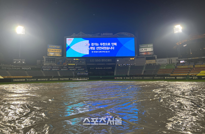 6일 인천 SSG랜더스필드에서 열린 2023 KBO리그 SSG와 롯데의 경기가 3회말 비로 인해 노게임이 선언되자 안내 메시지가 전광판에 표출되고 있다. 2023. 4. 6.
