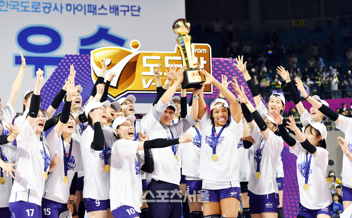 MVP 캣벨, 김종민 감독이 6일 인천 삼산월드체육관에서 열린 2022-2023 V리그 여자부 흥국생명과 한국도로공사의 챔피언결정전 5차전 5세트를 따내며 리버스스윕을 완성한 후 선수들과 한몸이 되어 트로피를 들고 우승의 기쁨을 만끽하고 있다.2023.04.06.
