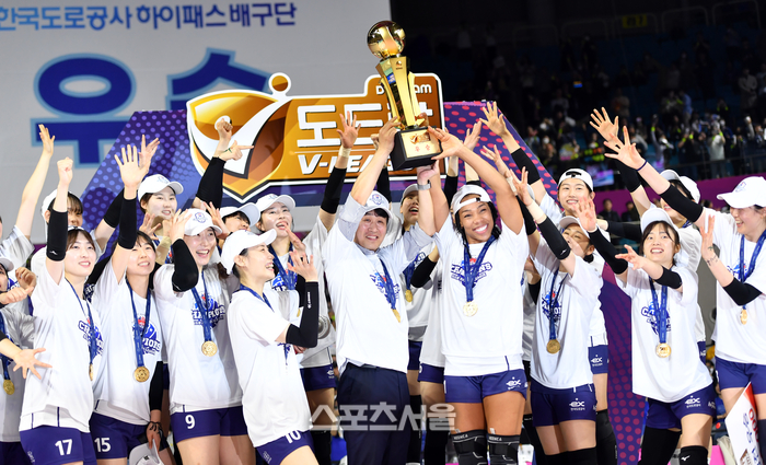 MVP 캣벨, 김종민 감독이 6일 인천 삼산월드체육관에서 열린 2022-2023 V리그 여자부 흥국생명과 한국도로공사의 챔피언결정전 5차전 5세트를 따내며 리버스스윕을 완성한 후 선수들과 한몸이 되어 트로피를 들고 우승의 기쁨을 만끽하고 있다.2023.04.06.