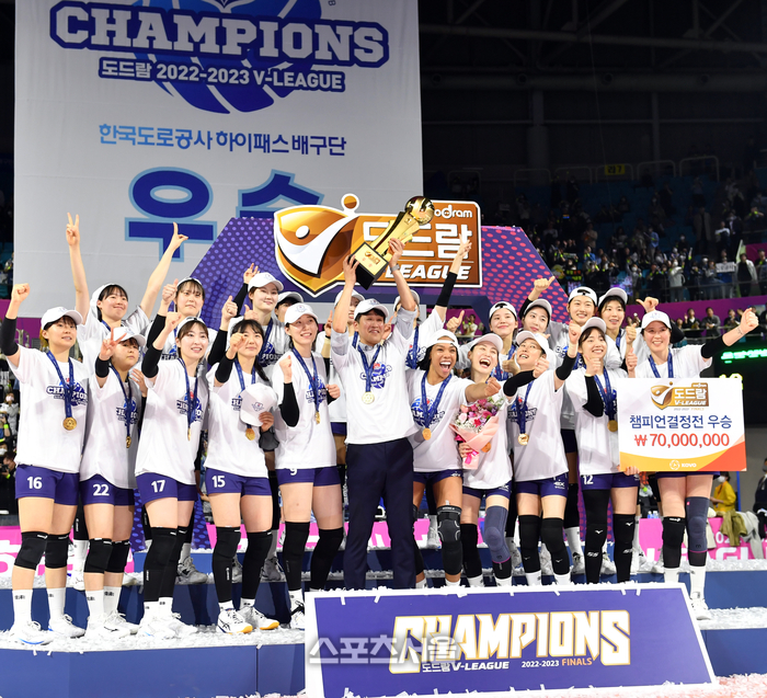 김종민 감독과 도로공사 선수들이 6일 인천 삼산월드체육관에서 열린 2022-2023 V리그 여자부 흥국생명과 한국도로공사의 챔피언결정전 5차전 5세트를 따내며 리버스스윕을 완성한 후 시상대에 올라 우승컵을 들고 기쁨을 만끽하고 있다.2023.04.06.