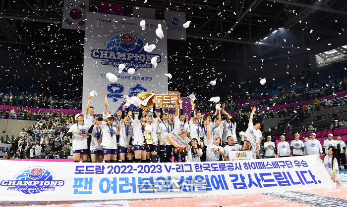 김종민 감독과 도로공사 선수들이 6일 인천 삼산월드체육관에서 열린 2022-2023 V리그 여자부 흥국생명과 한국도로공사의 챔피언결정전 5차전 5세트를 따내며 리버스스윕을 완성한 후 시상대에 올라 우승컵을 들고 기쁨을 만끽하고 있다.2023.04.06.