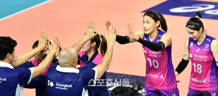 흥국생명 맏언니 김연경이 5세트를 내준 후 아본단자 감독과 하이파이브를 나누고 있다. 2023.04.06.