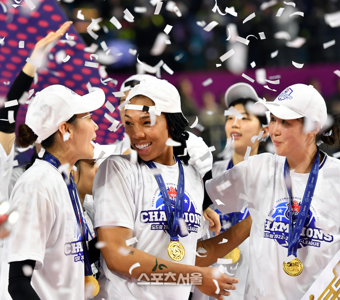 도로공사 MVP 캣벨이 정대영, 배유나의 축하를 받고 있다. 2023.04.06.