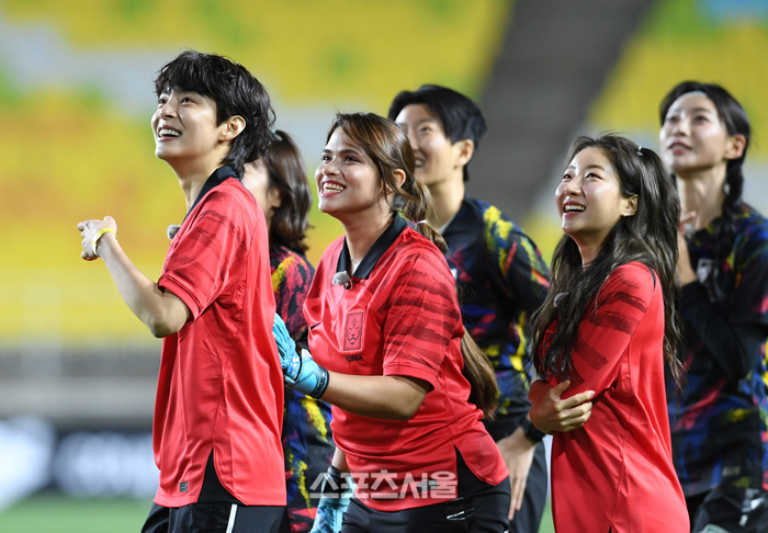 SBS 예능 ‘골 때리는 그녀들’ 출연자들이 7일 수원월드켭경기장에서 열린 한국 여자축구대표팀과 잠비아와 평가전 하프타임 때 승부차기를 하기 위해 그라운드로 나가면서 전광판에 나오는 자신들의 모습을 보고 있다. 2023. 4. 7.