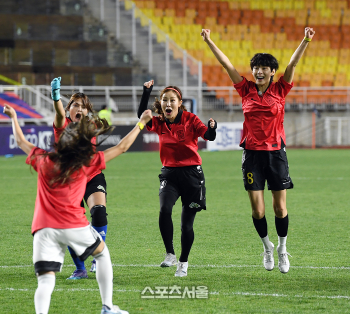 SBS 예능 ‘골 때리는 그녀들’에 출연 중인 안예원(맨 왼쪽)가 7일 수원월드켭경기장에서 열린 한국 여자축구대표팀과 잠비아와 평가전 하프타임 때 승부차기를 성공하자 케시(왼쪽 둘째)와 채리나(왼쪽 셋째), 정혜인이 함께 기뻐하고 있다. 2023. 4. 7.