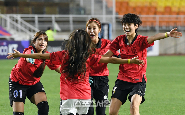 SBS 예능 ‘골 때리는 그녀들’에 출연 중인 안예원(왼쪽 둘째)가 7일 수원월드켭경기장에서 열린 한국 여자축구대표팀과 잠비아와 평가전 하프타임 때 승부차기를 성공하자 케시(맨 왼쪽)와 채리나(왼쪽 셋째), 정혜인이 함께 기뻐하고 있다. 2023. 4. 7.