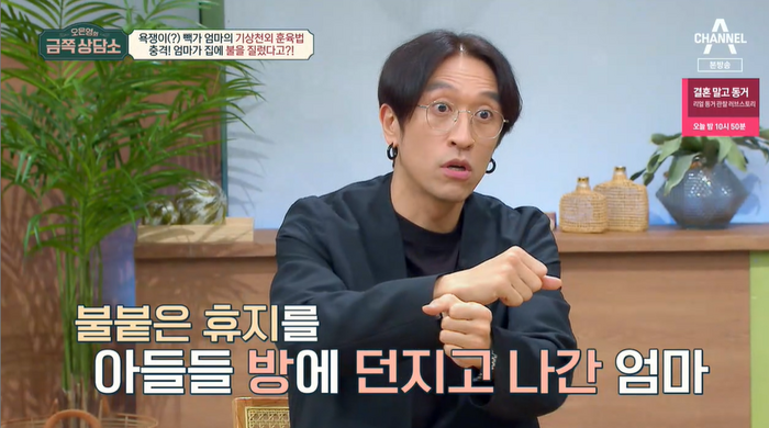그는 “동생이랑 싸우니까 엄마가 경고했다. 몇 번 경고하더니 ‘불을 싸지르기 전에 조용히 하라’고 하시더라. 그래도 계속 싸우니까 다시 들어오시더니 두루마리 휴지에 불을 붙이고 방에 던졌다. 그 이후로 ‘엄마의 경고를 허투루 들으면 안 되겠다’라고 생각했다”고 말했다.