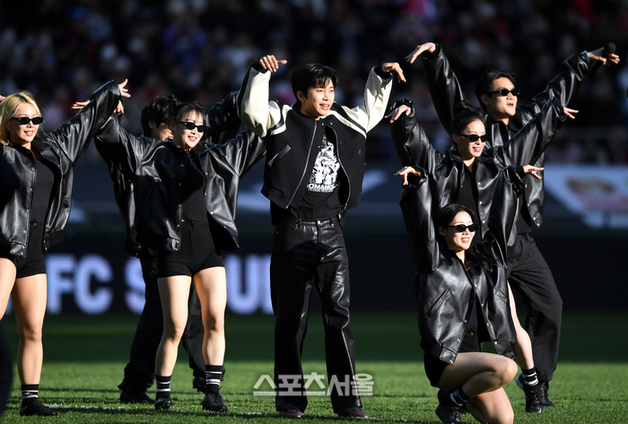 임영웅이 8일 서울 월드컵경기장에서 열린 K리그1 FC서울과 대구FC와 경기 하프타임에 걸그룹아이브의 애프터 라이크(After LIKE)에 맞춰 댄스를 선보이고 있다.