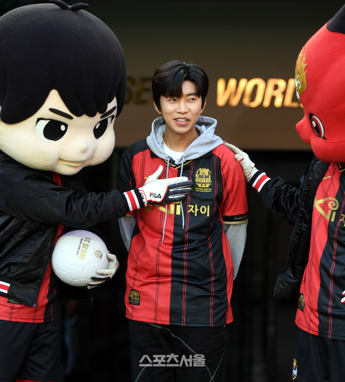 임영웅이 8일 서울 월드컵경기장에서 열린 K리그1 FC서울과 대구FC와 경기에 앞서 시축 순서를 기다리며 마스코트와 이야기를 나누고 있다.