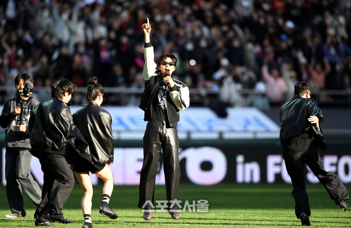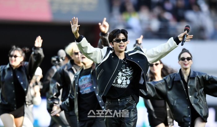 하프타임에 선글라스를 끼고 등장한 임영웅은 댄서들과 함께 그라운드 위 공연을 펼쳤다. ‘히어로’ EDM 버전으로 흥을 돋운 임영웅은 지난해 전국투어 콘서트 ‘아임 히어로(IM HERO)’ 앙코르 서울 공연에서 선보인 아이브의 ‘애프터 라이크(After Like)’ 커버 무대를 다시 선보여 환호를 이끌어 냈다.