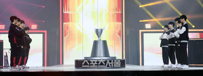T1(왼쪽)과 젠지 선수들이 9일 서울 잠실실내체육관에서 열리는 ‘2023 LoL 챔피언스 코리아 스프링’ 결승전에 앞서 도열해 있다.