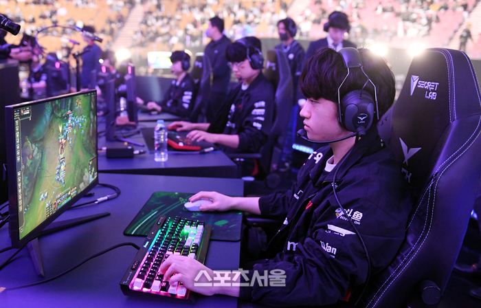 T1 선수들이 9일 서울 잠실실내체육관에서 열린 ‘2023 LoL 챔피언스 코리아 스프링’ 결승전에 앞서 장비 점검을 하고 있다.