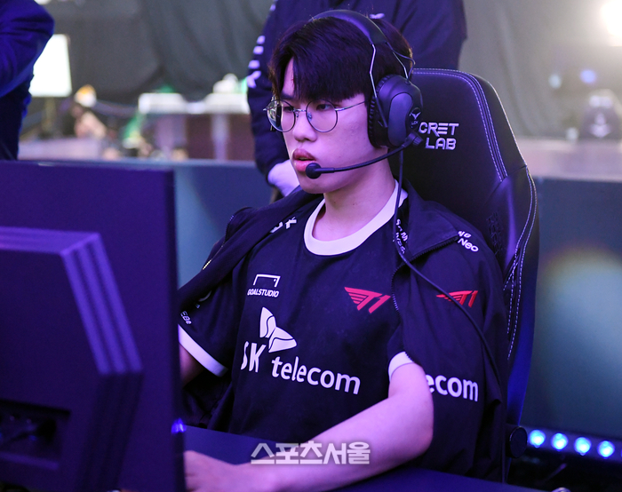 T1 오너 문현준이 9일 서울 잠실실내체육관에서 열린 ‘2023 LoL 챔피언스 코리아 스프링’ 결승전에 앞서 장비 점검을 하고 있다.