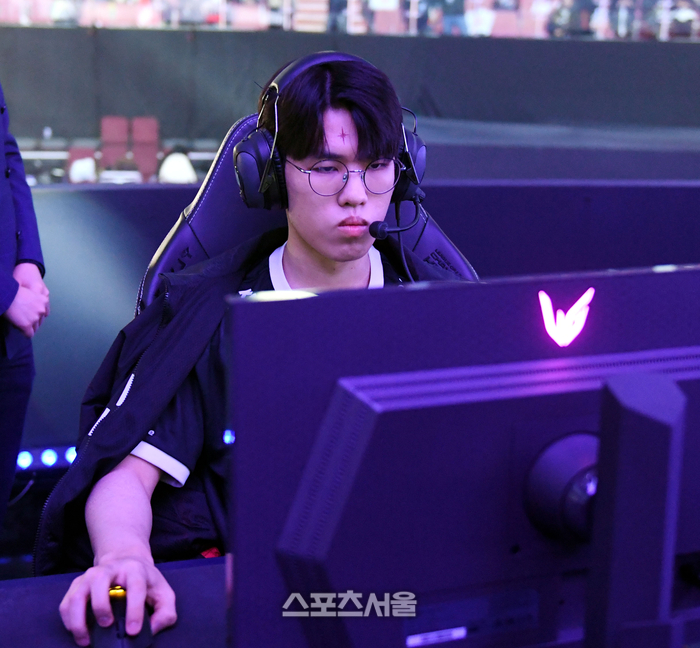 T1 오너 문현준이 9일 서울 잠실실내체육관에서 열린 ‘2023 LoL 챔피언스 코리아 스프링’ 결승전 젠지와 경기에 앞서 장비 점검을 하고 있다.