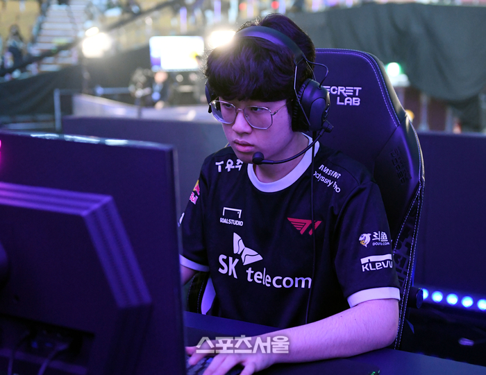 T1 제우스 최우제가 9일 서울 잠실실내체육관에서 열린 ‘2023 LoL 챔피언스 코리아 스프링’ 결승전 젠지와 경기에 앞서 장비 점검을 하고 있다.