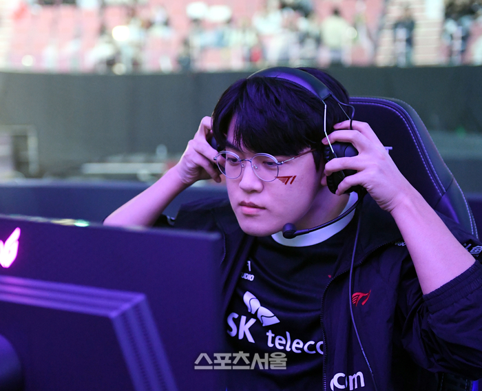 T1 구마유시 이민형이 9일 서울 잠실실내체육관에서 열린 ‘2023 LoL 챔피언스 코리아 스프링’ 결승전 젠지와 경기에 앞서 장비 점검을 하고 있다.