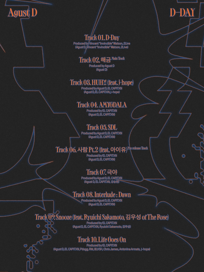 슈가는 10일 방탄소년단의 공식 SNS에 Agust D로 발매하는 솔로 앨범 ‘D-DAY’의 트랙리스트를 올렸다. 전반적으로 어두운 분위기에 오렌지와 블루 컬러의 감각적인 선들이 교차되는 그래픽을 배경으로 수록곡들이 순서대로 나열돼 있다.
