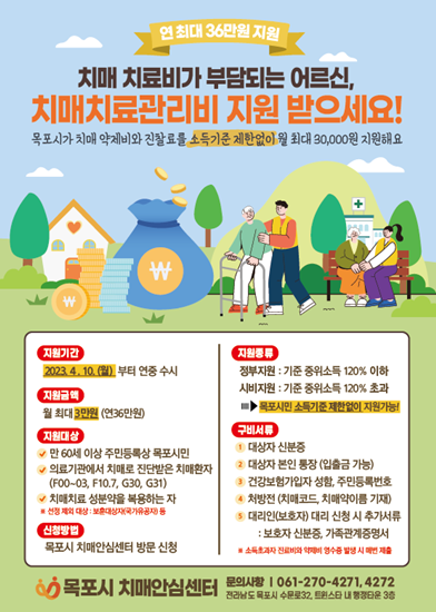 지원내용은 신청일 기준 주민등록상 목포시에 거주하며 치매안심센터에 등록된 치매환자로, 치매약 처방 당일 진찰료와 치매 약제비의 본인부담금으로 최대 월 3만원, 연간 36만원까지 지원 받을 수 있으며,