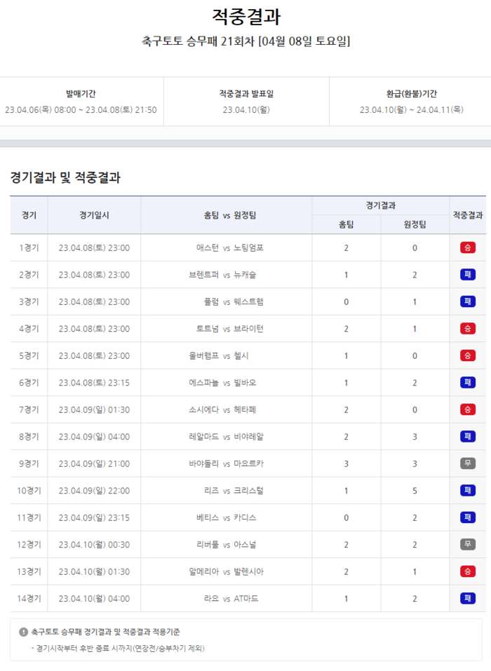 이번 21회차에서 1등이 나오지 않은 건, EPL과 라리가 모두 다소 의외의 결과가 펼쳐졌기 때문이다. 상대적 적중자가 줄아들며 2등부터 4등까지의 적중자들은 타 회차보다 많은 환급 금액을 받게 됐다.