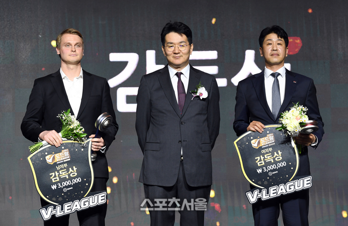 대한항공 토미 틸리카이넨 감독(왼쪽)과 도로공사 김종민 감독(오른쪽)이 10일 서울 용산구 그랜드하얏트 그랜드볼룸에서 진행된 도드람 2022-2023 V-리그 시상식에서 감독상을 수상한 뒤 시상자인 조원태 배구연맹 총재와 기념촬영을 하고 있다. 2023. 4. 10.