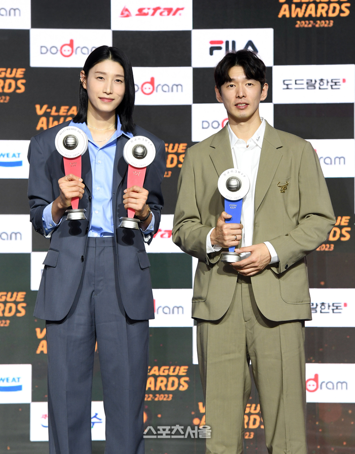 흥국생명 김연경(왼쪽)과 대한항공 한선수가 10일 서울 용산구 그랜드하얏트 그랜드볼룸에서 진행된 도드람 2022-2023 V-리그 시상식에서 MVP로 선정된 뒤 기념 촬영을 하고 있다. 2023. 4. 10.