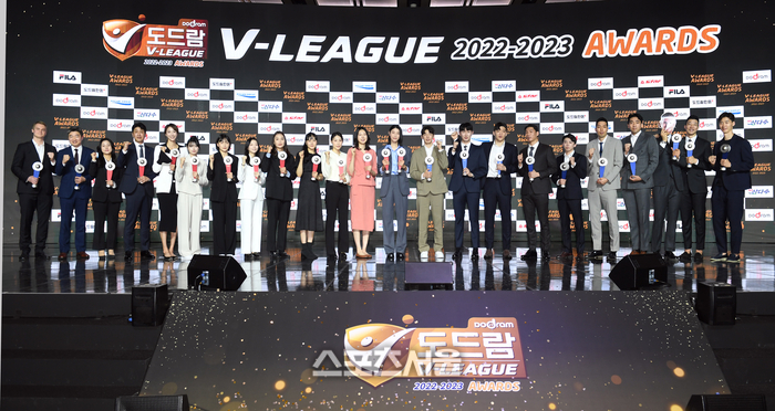 스포츠 | 배구 [포토]V-리그 시상식, 수상자들의 기념 촬영 입력2023-04-10 18:10:33 북마크 페이스북 트위터 SNS 더보기 가글자크기설정 인쇄 SNS 더보기 닫기 네이버밴드 네이버블로그 URL복사 글자크기 설정 메뉴 닫기 글자크기 설정 시 다른 기사의 본문도동일하게 적용됩니다. 가 가 가 가 가 10일 서울 용산구 그랜드하얏트 그랜드볼룸에서 진행된 도드람 2022-2023 V-리그 시상식에서 수상자들이 기념 촬영을 하고 있다. 2023. 4. 10.박진업기자 upandup@sportsseoul.com 기사추천 0