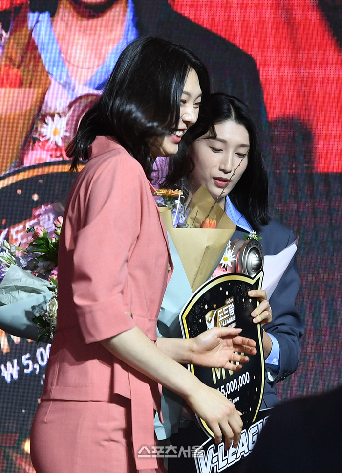 흥국생명 김연경(오른쪽)이 10일 서울 용산구 그랜드하얏트 그랜드볼룸에서 진행된 도드람 2022-2023 V-리그 시상식에서 여자부 MVP로 선정된 뒤 양효진의 축하를 받고 있다. 2023. 4. 10.