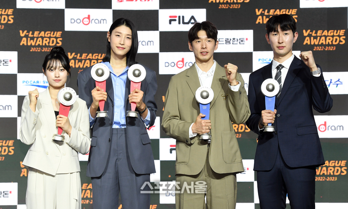10일 서울 용산구 그랜드하얏트 그랜드볼룸에서 진행된 도드람 2022-2023 V-리그 시상식에서 여자부 신인선수상 KGC인삼공사 최효서, MVP 흥국생명 김연경, 남자부 MVP 대한항공 한선수, 신인선수상 삼성화재 김준우가 기념촬영을 하고 있다. 2023. 4. 10.