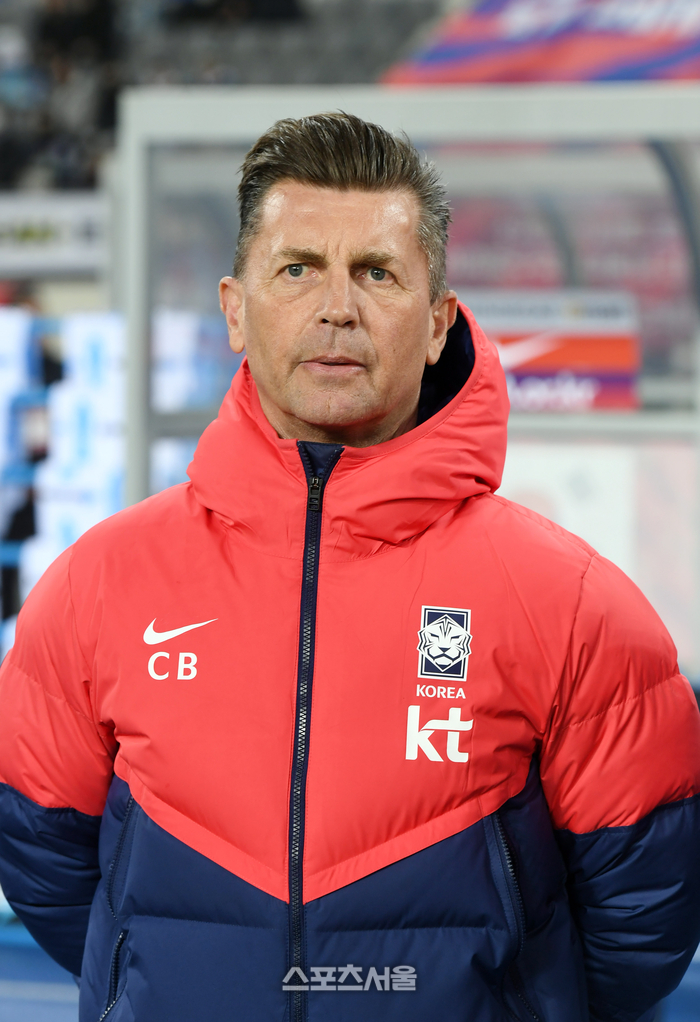 한국 여자축구대표팀의 콜린 벨 감독이 11일 용인 미르스타디움에서 열린 잠비아와 2차 평가전에 앞서 그라운드를 바라보고 있다. 2023. 4. 11.