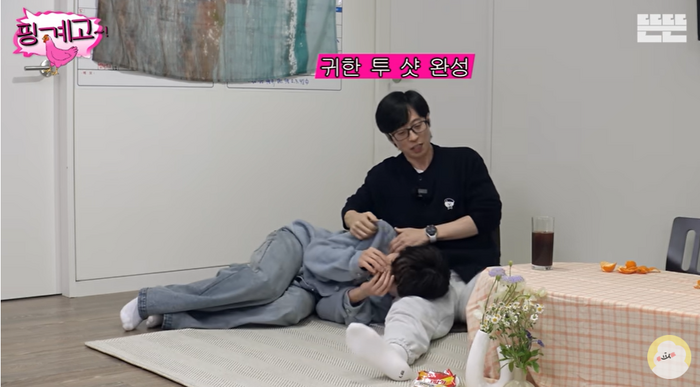 형들의 호응에 웃음이 터진 지민은 “사실 저한테 너무 집중되는 분위기에 긴장된다”고 했고 유재석은 “그럼 노룩토크할게”라며 공약했다. 이어 유재석은 좀 더 편해지면 좋겠다면서 “네가 무릎베개 하면 좋겠다”고 말했고, 지민은 성큼 일어나 유재석의 무릎을 배고 어깨에 기대며 ‘인생샷’을 연출했다.